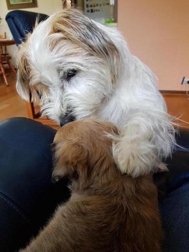 Ollie continues to be selfish with his toys with Peanut. If he has a favourite toy and Peanut wants to play with it, Ollie takes it from her quite gently and tries to walk out of the back door in order to hide it somewhere safe in the yard. However Peanut has worked this trick of his out, follows behind him, takes it back and puts it in her bed or runs away with it. The two of them keep us laughing all the time. They have become the best of friends and get up to all sorts of mischief. We just love them. Eddie’s biological brother also came to visit a couple of weeks ago. Eddie lives in the Hobart area too. He was born to the same parents as Ollie but 8 months earlier. We now know Ollie and Eddie’s parents have been spayed and there will be no more litters from them. We thank them for having these wonderful boys.