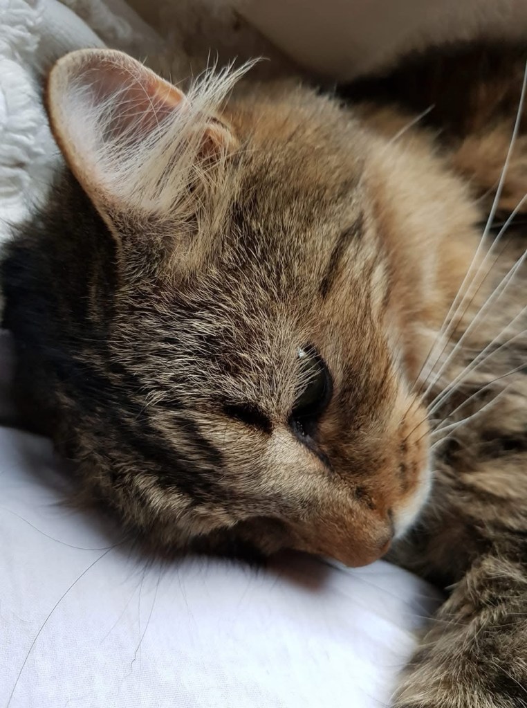 Pickles is walking around the house more and more. She explores it a lot while we sleep but she came face to face with our little maternal Peanny this morning and did not bat an eye. Penny does not chase her as Ollie might.