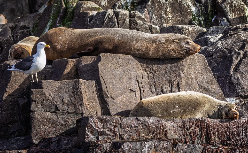 This was taken from the Pennicott boat tour in the Tasman sea. Australian fur seals and a Pacific gull.