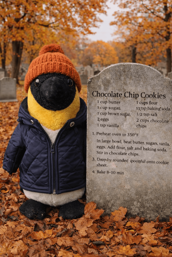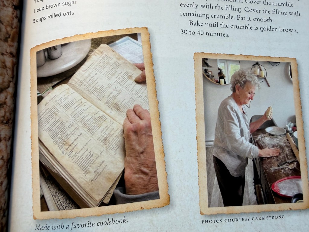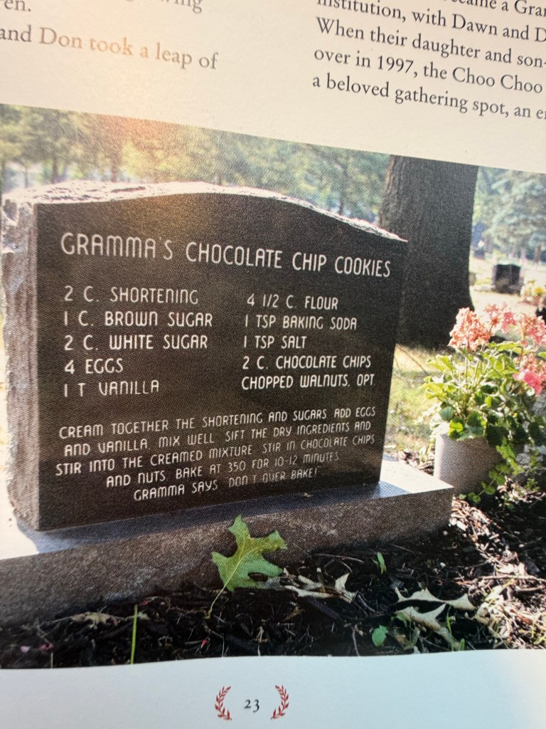 The book is full of gravestone photographs. Now, photographers get photos of all kinds of themed ideas. This one is gravestones. There isn’t much new with that idea but these are gravestones with recipes on them. Little old ladies who passed away and are remembered for their wicked biscuits (cookies to you N Americans), pies or cakes, etc.