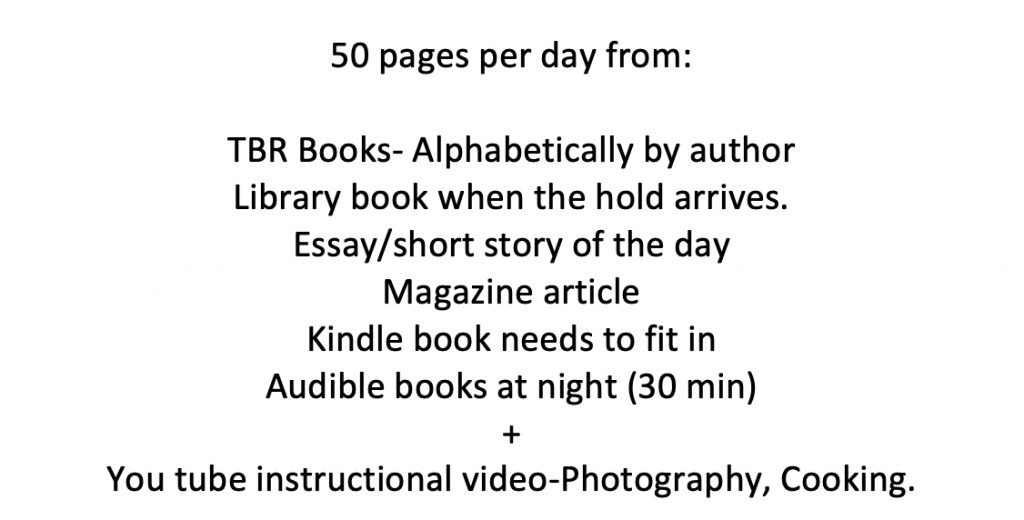 My baseline goal is to read 50 pages per day from one of the above challenges. I should not call them challenges as that is the fastest way I know of to fall off the wagon, so to speak. Anyway, that’s the plan and we’ll see how we go. I won’t mention my daily journal writing and learning to draw book. I’m making myself laugh now.