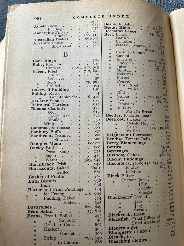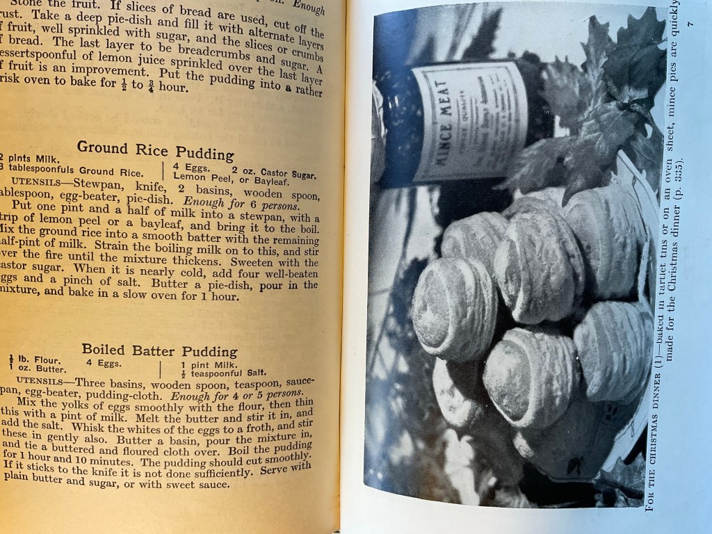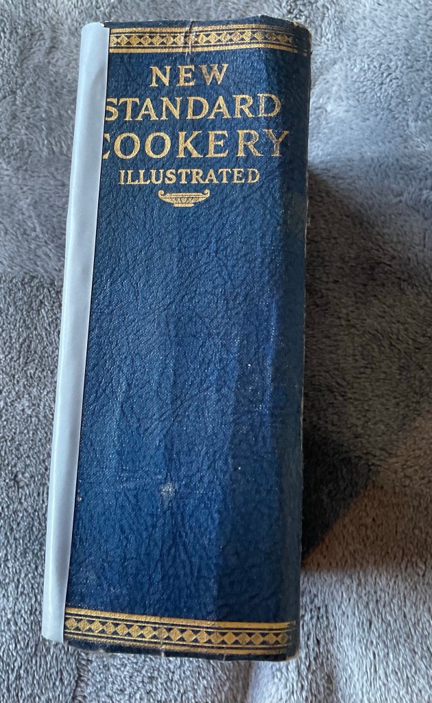 Now- the book from my shelf is one my neighbour’s (who just passed away,) sister gave me. It is a very old 1933, hardcover cook book called the New Standard Cookery Illustrated edited by Elizabeth Craig. Oldham Press Limited W,C. London.